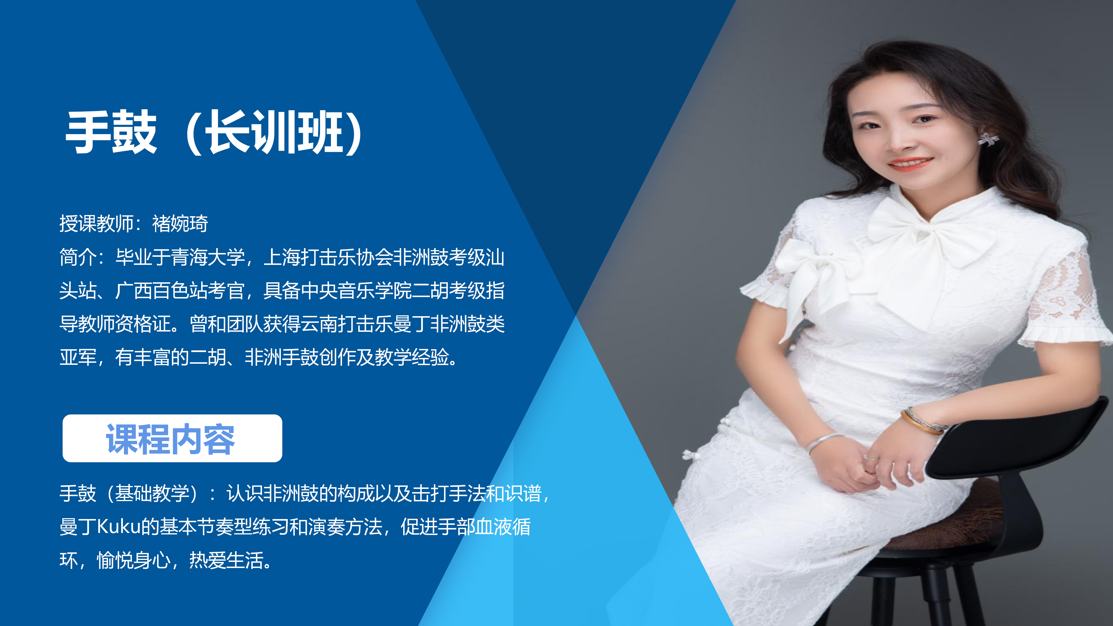 1、手鼓(基础教学):认识非洲鼓的构成以及击打手法和识谱,曼丁Kuku的基本节奏型练习和演奏方法,促进手部血液循环,愉悦身心,热爱生活;