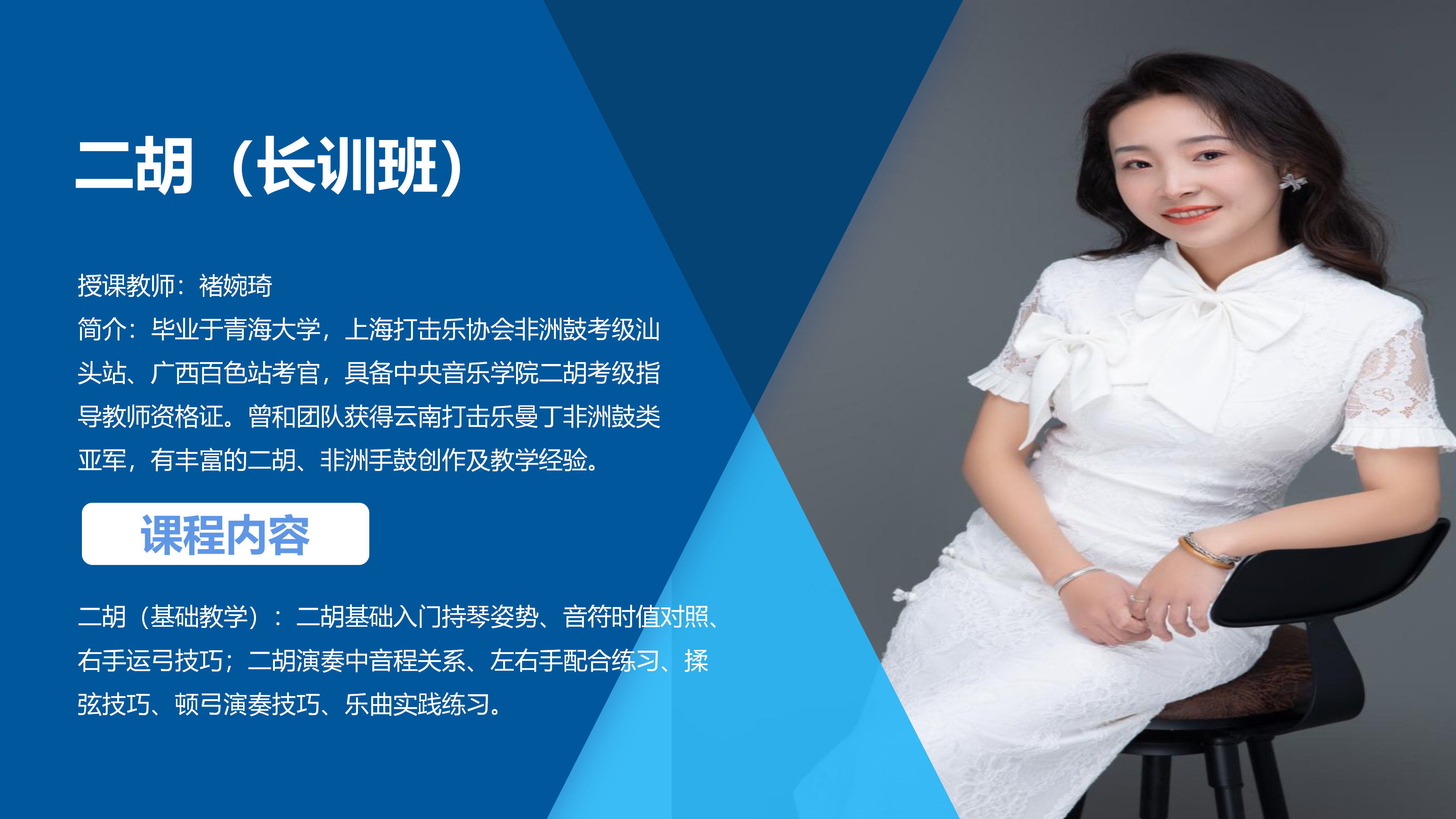 4、二胡(基础教学):二胡基础入门持琴姿势、音符时值对照、右手运弓技巧;二胡演奏中音程关系、左右手配合练习、揉弦技巧、顿弓演奏技巧、乐曲实践练习。